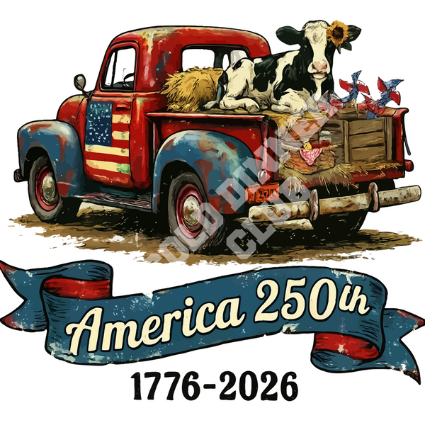 With an adorable black and white cow, charming vintage pickup truck and commemorative text of America 250th 1776-2026.